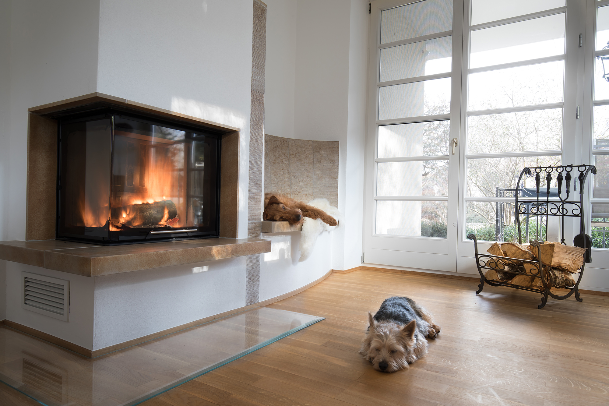 Biały salon z narożnym kominkiem i stojakiem na drewno.