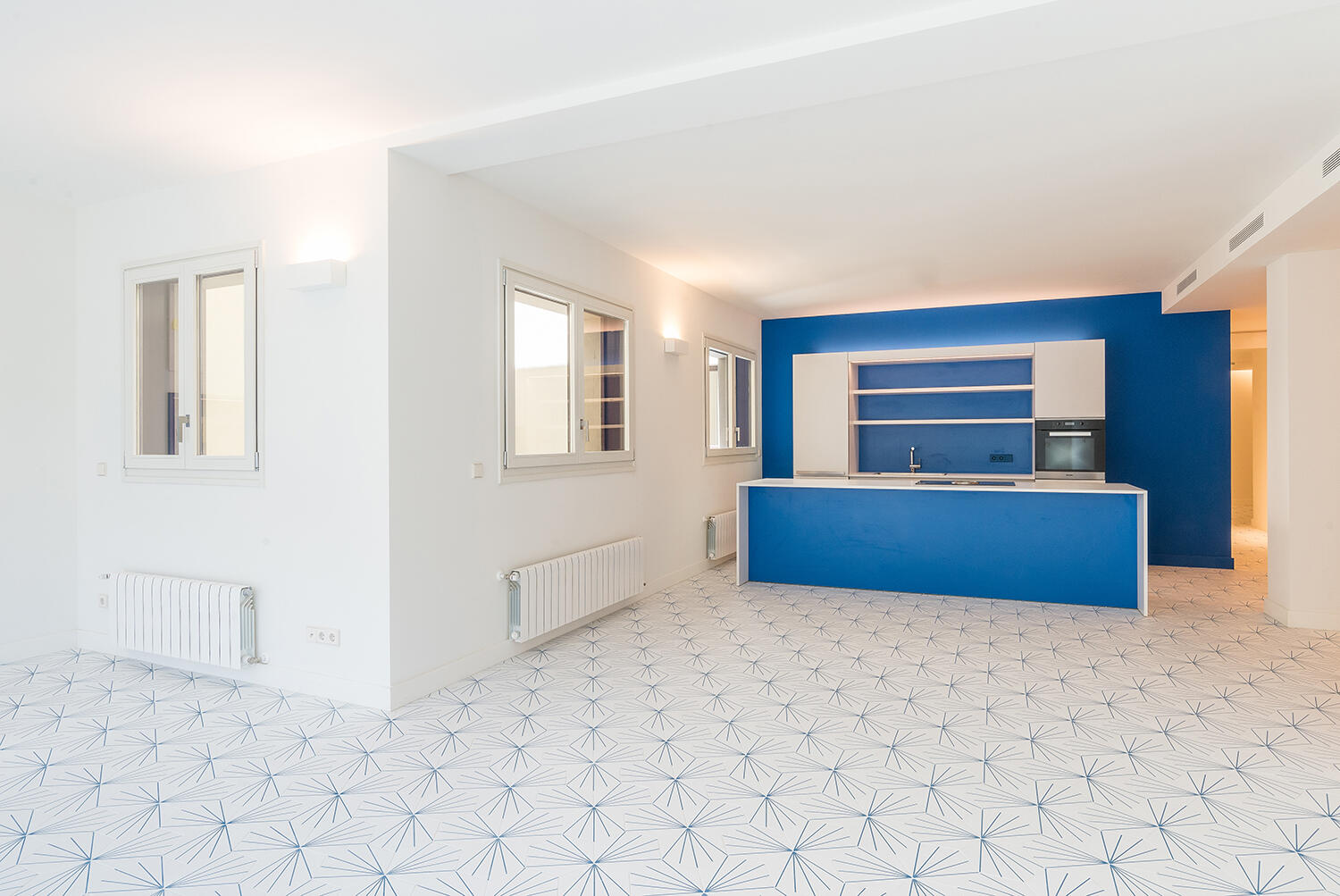 Duża kuchnia z oknami i niebiesko-białą wyspą oraz białą podłogą z wzorem.