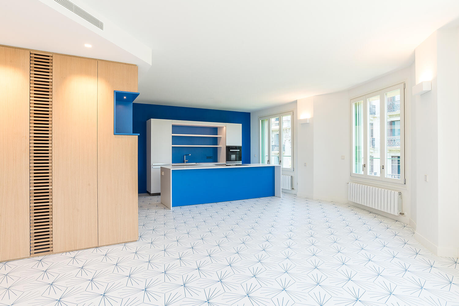 Duża kuchnia z wyspą w niebieskim kolorze i z białym blatem roboczym