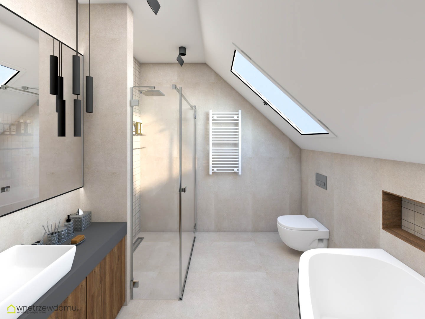Łazienka z prysznicem typu walk-in i wanną w zabudowie na poddaszu.