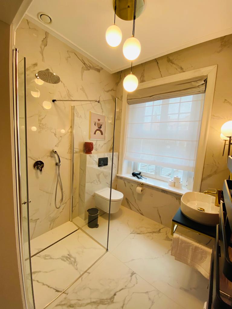 Nowoczesna łazienka hotelowa z płytkami gresowymi na podłodze i ściennie