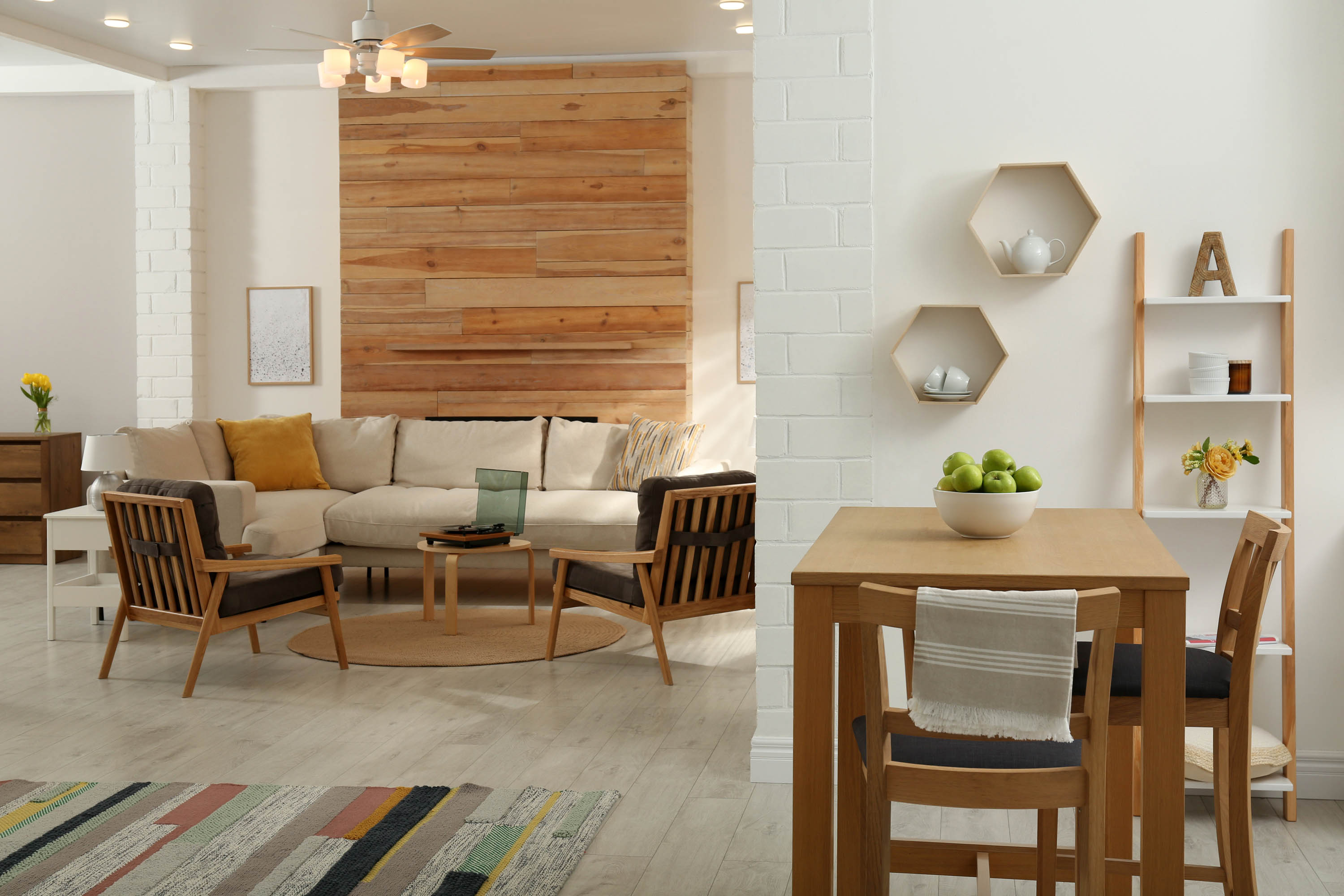 Salon z jadalnią z drewnianym stołem