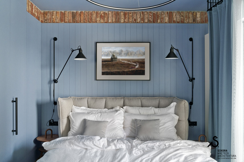 Błękitny apartament z elementami drewna